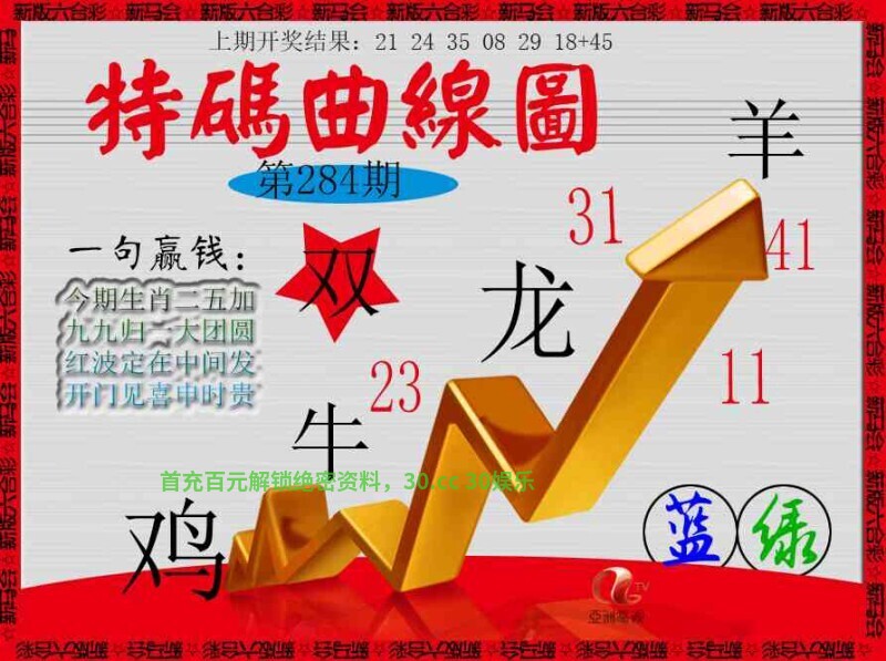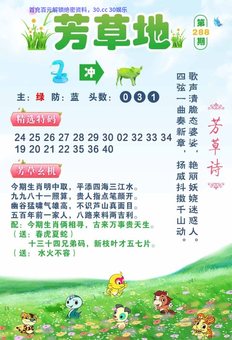 288期芳草玄机:今期生肖明中取,平添四海三江水。九九八十一照算,贵人指点笔颜开。幽谷猛啸气雄高,不识芦山真面目。五百年前一家人,八路来料两吉利。 芳草诗:四弦一曲奏新章,扬威抖擞千山动。歌声清脆态婆娑,艳丽妖娆迷惑人。 传奇特肖:猪牛龙虎蛇兔猴 发财波色:绿蓝 内幕头数:031 |